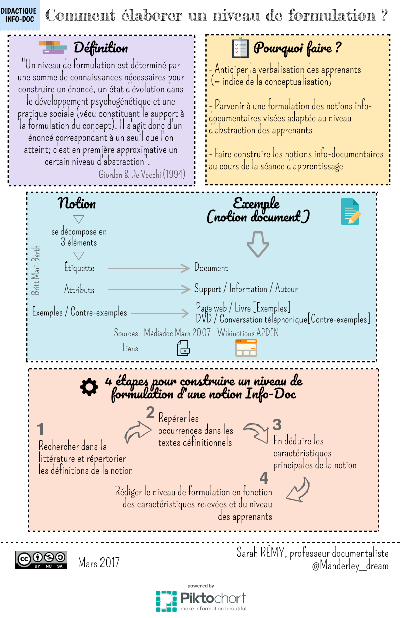 Par exemple pour une première approche de la notion de Document, on peut se limiter à deux caractéristiques essentielles : un « support matériel » et un « contenu informationnel ». Ce qui permet d’aboutir à la formulation suivante : « Un document est un support matériel qui contient des informations. » - Niveau de formulation avancé :